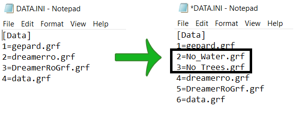 • Download the desired GRFs • Place them inside your DreamerRO root folder (same directory as Patcher and client) • Locate a file called "DATA.INI" in your DreamerRO root folder and open it with Notepad • Edit the file by writing the name of any newly downloaded GRF at the top of the list under gepard.grf • Proceed to re-number any GRF below the one you added
